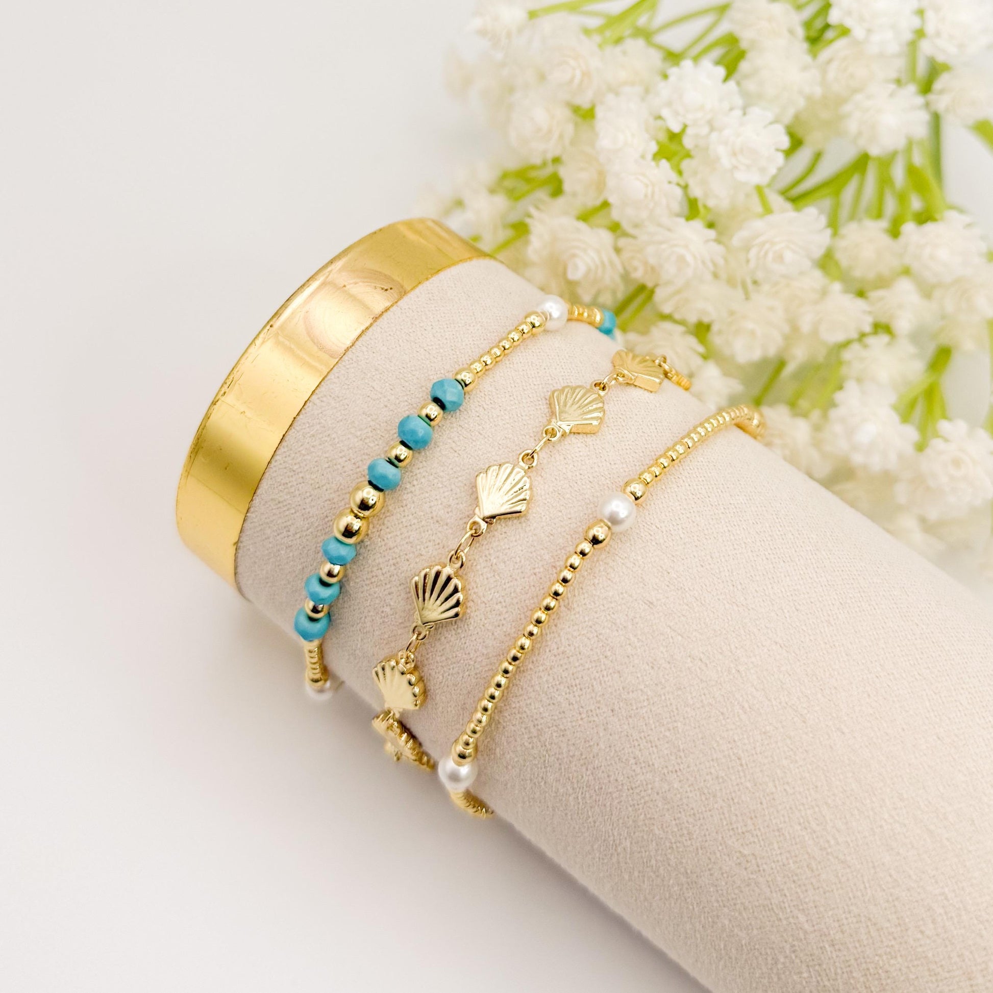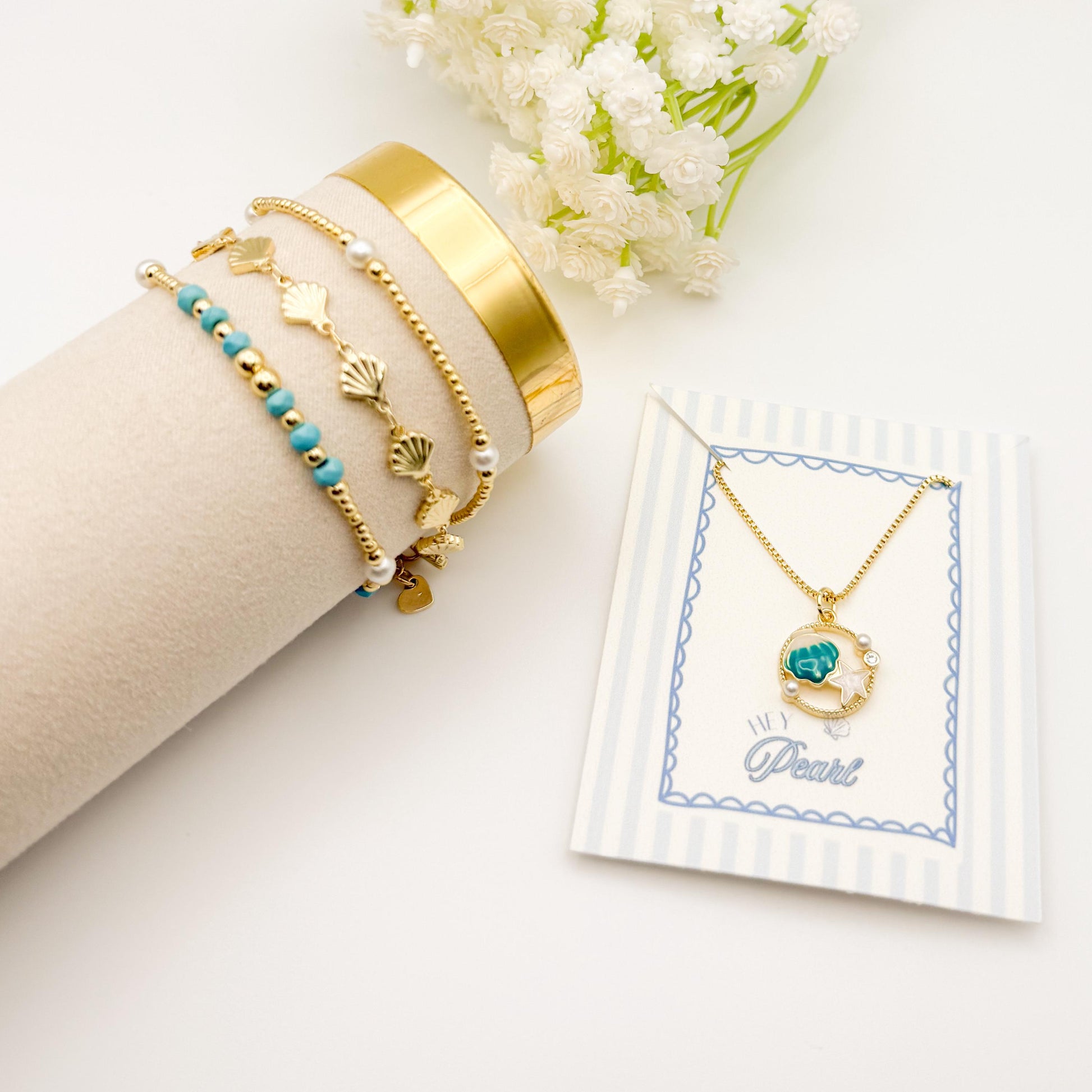 - A gold beaded bracelet with pearls, a gold beaded bracelet with teal and pearl beads, a seashell chain bracelet and a seashell pendant necklace