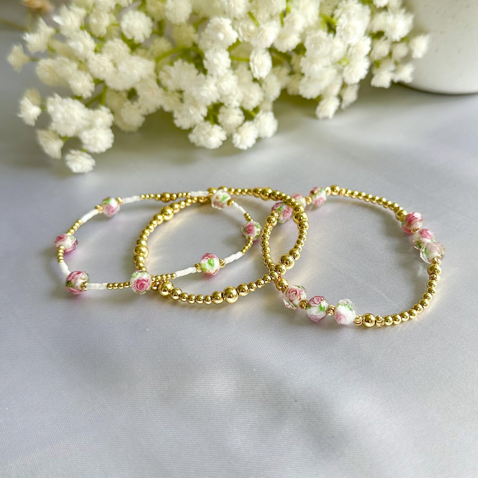 Floral pink and gold bead bracelet | 18k gold filled beads with pink floral bead bracelets