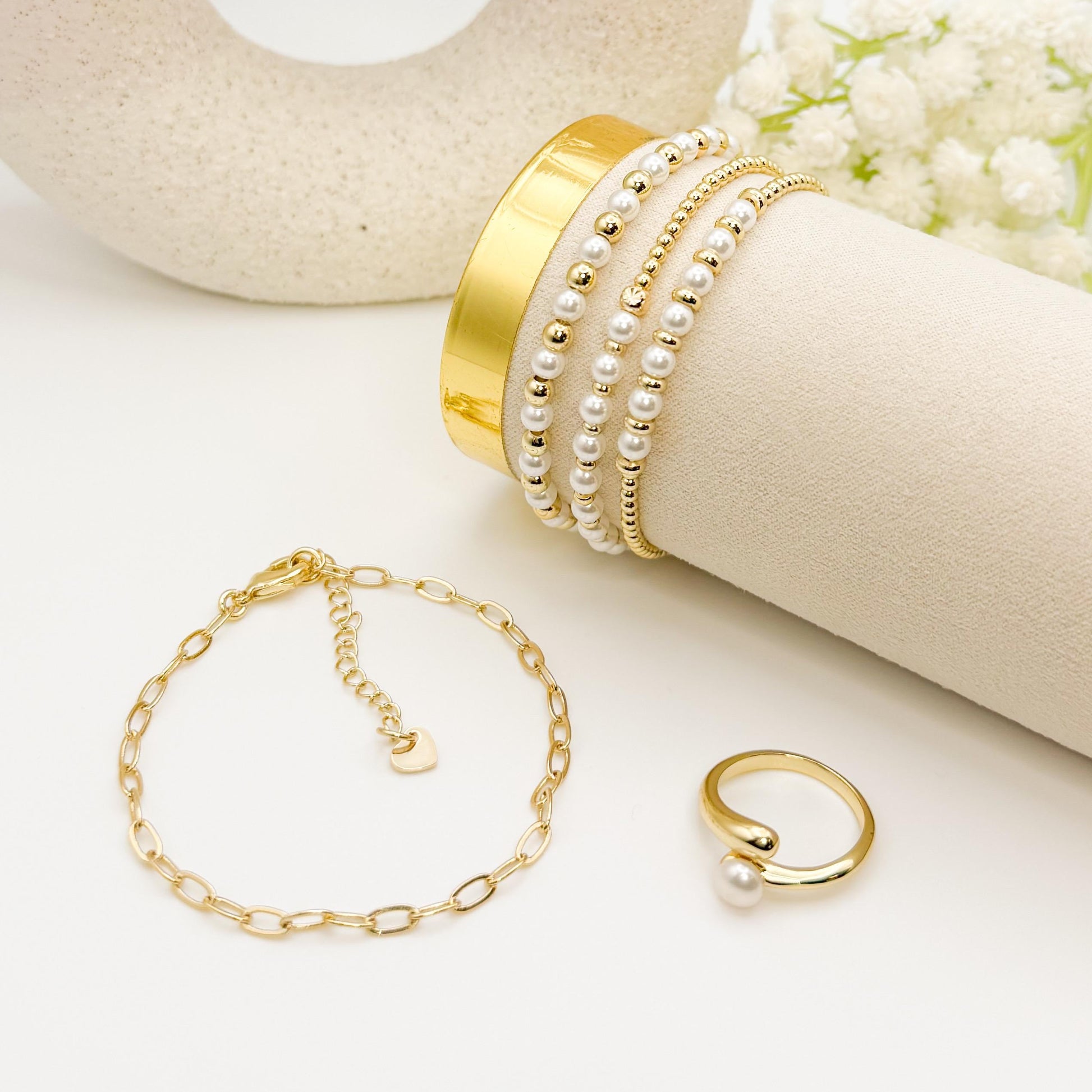 - 3 Gold and Pearl Beaded Bracelets, 1 chain adjustable bracelet and 1 adjustable ring