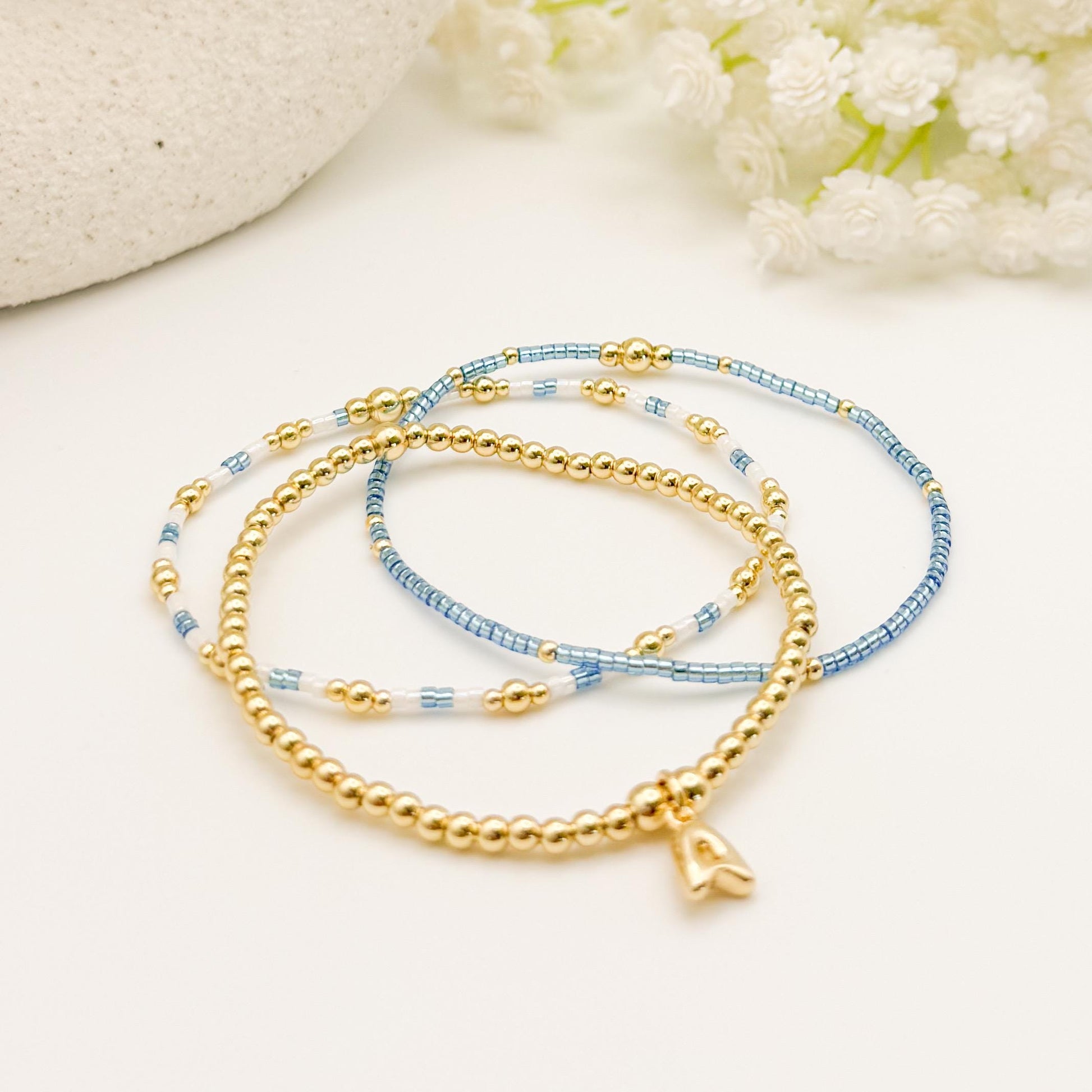 - A gold bead bracelet with initial charm of your choice along with two matching colorful miyuki bead bracelets