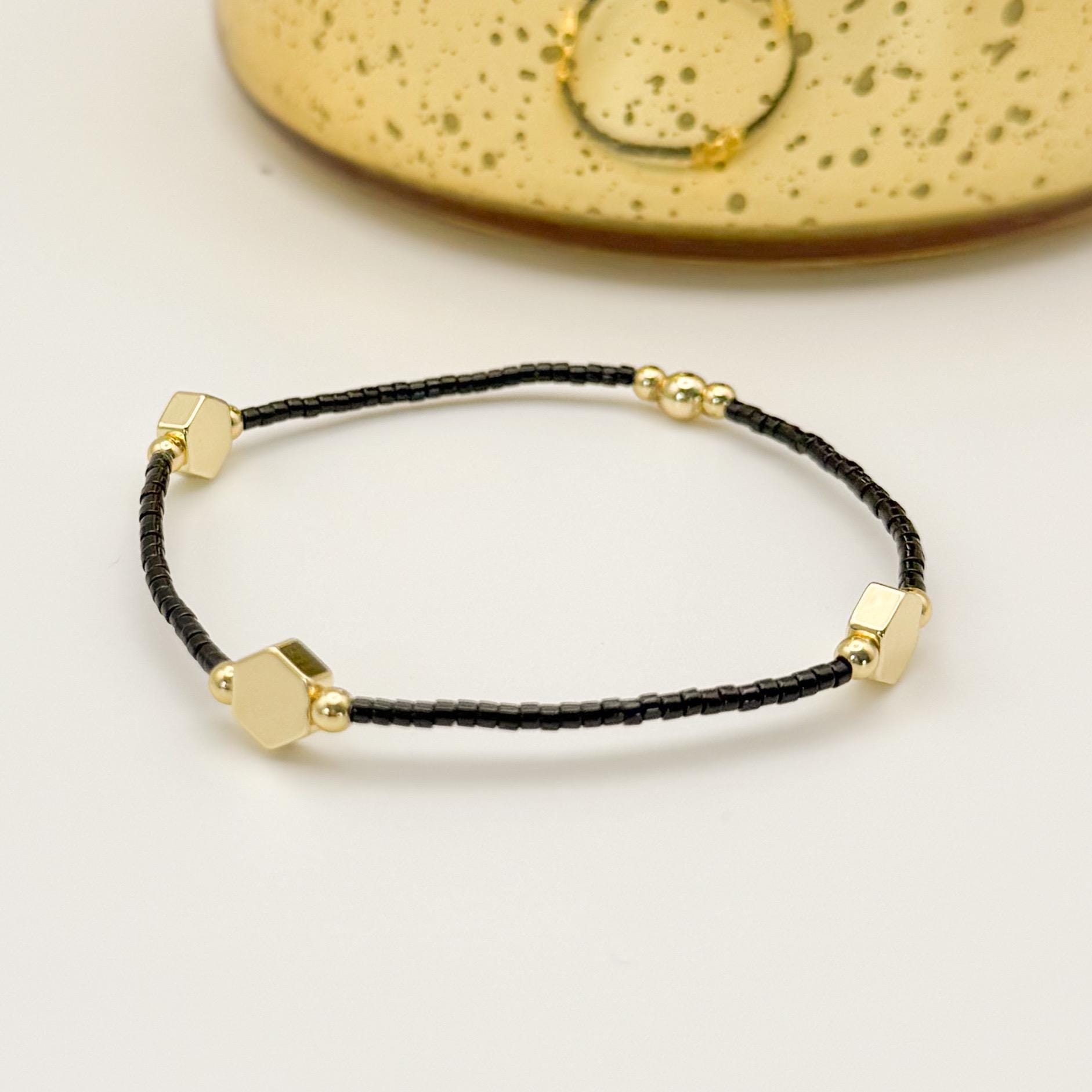 Midnight Glow | 18k gold filled with black and cream bracelet stack | beaded stretch bracelet | tiny bead bracelet | seed bead | holiday