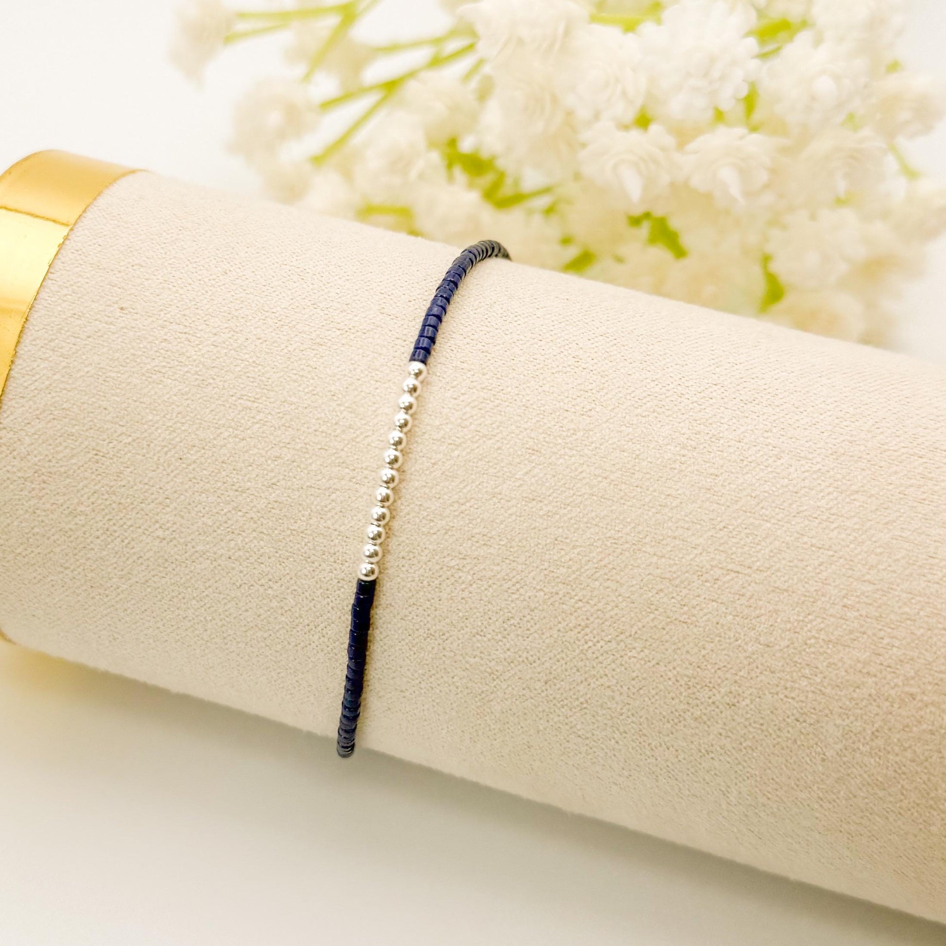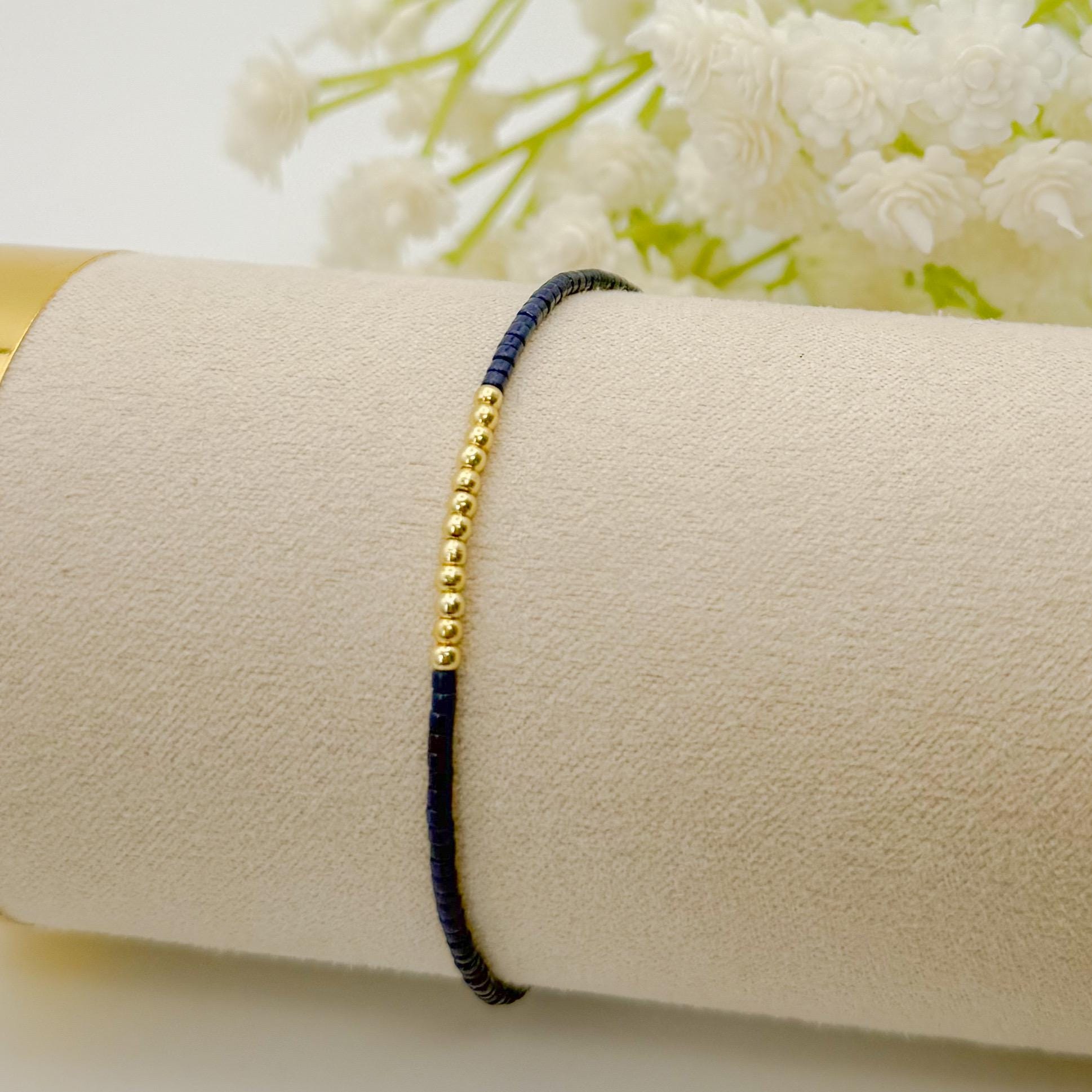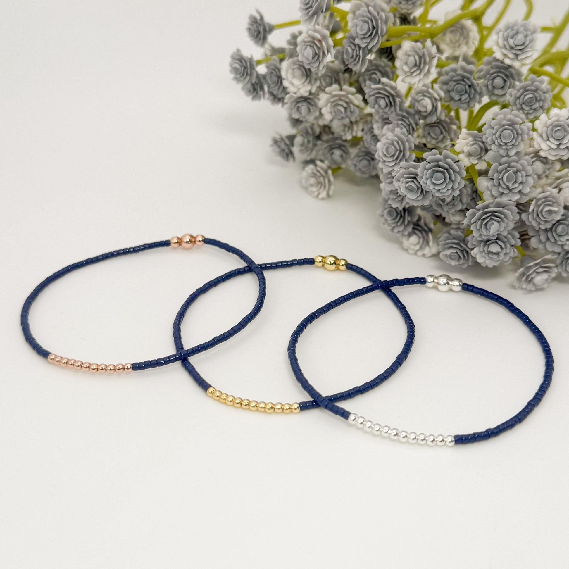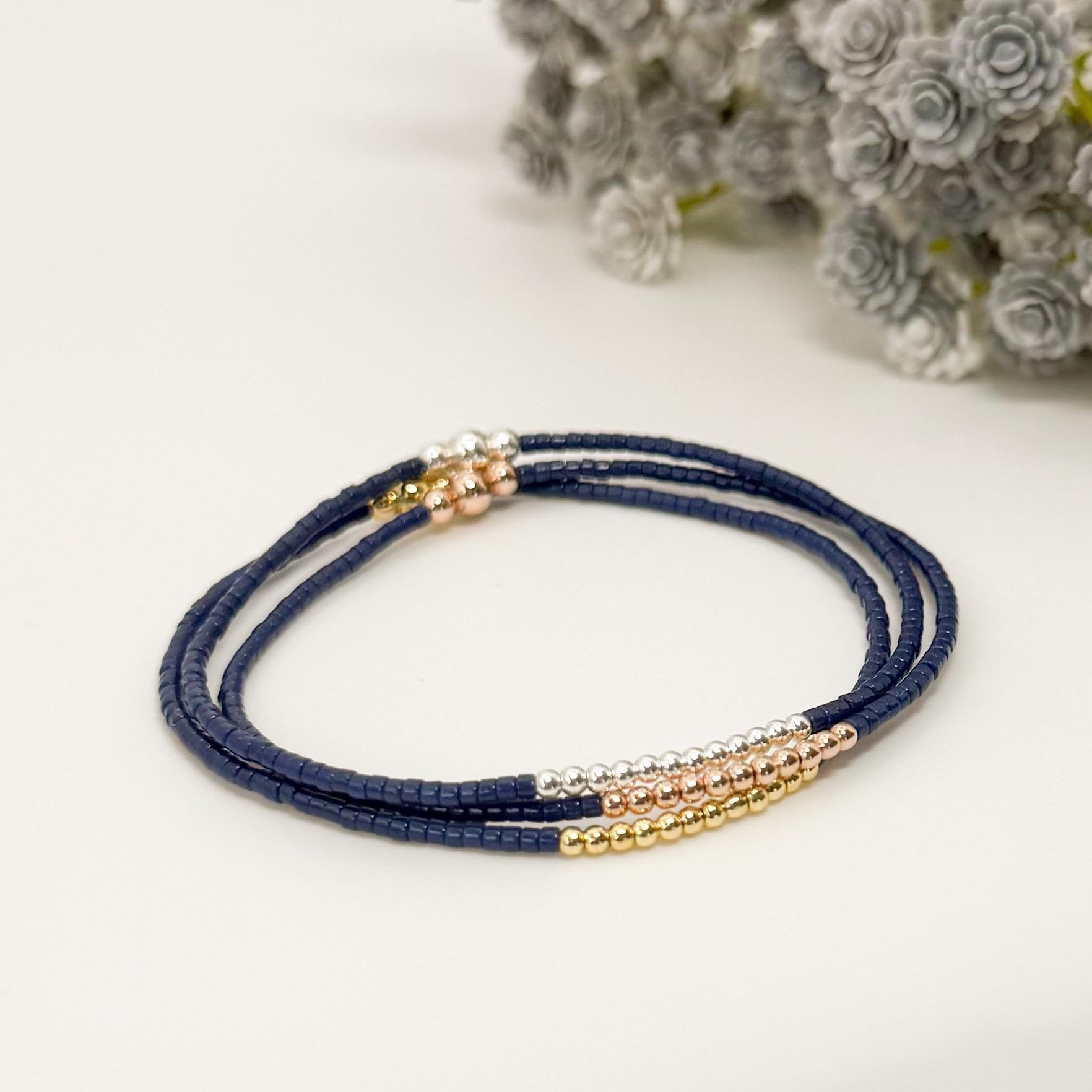Navy 3 tone bracelets | 18k gold filled with sterling silver and Rose gold beads | navy with mixed metals | tiny bead stretch bracelets