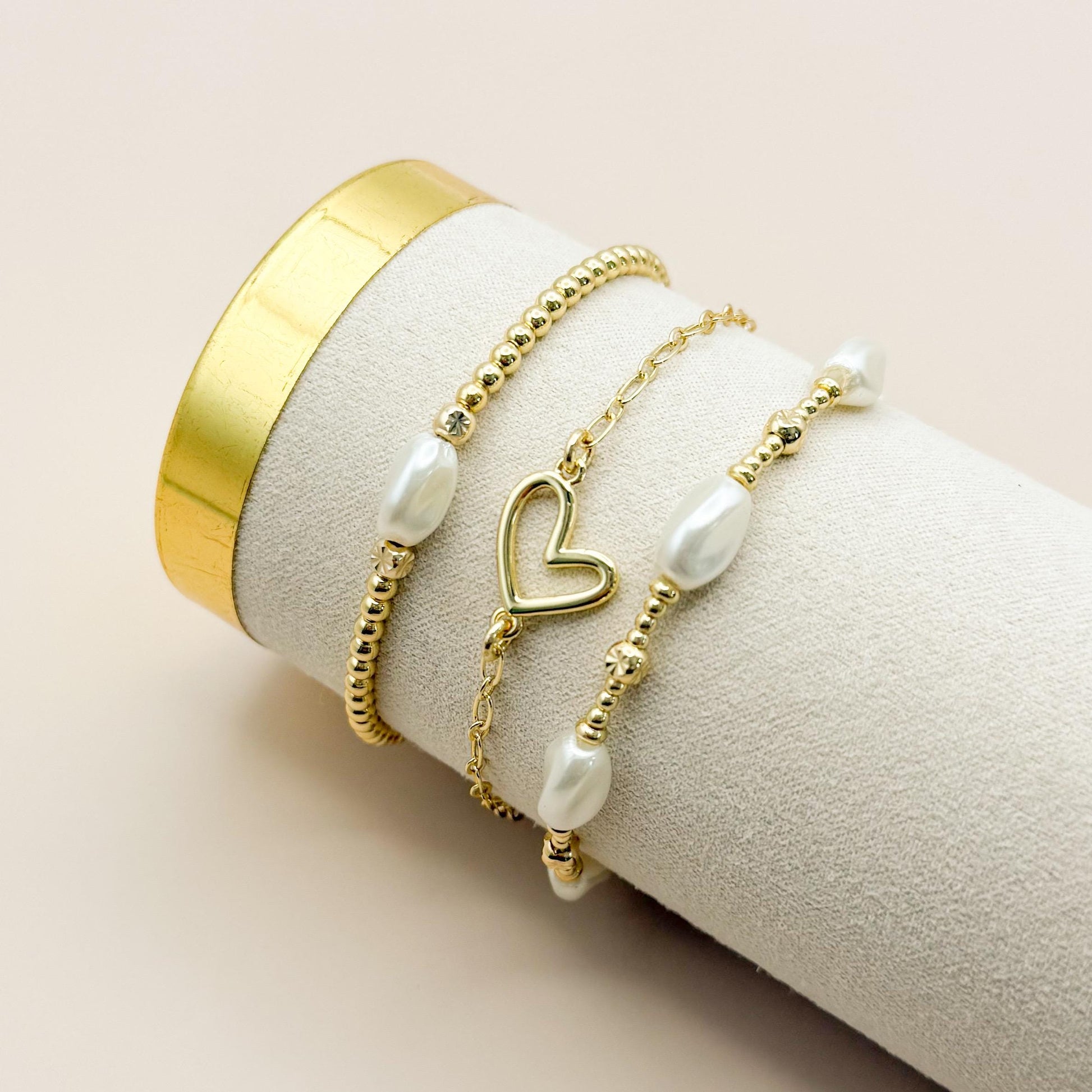 Pearl and Heart Stack | 18k gold filled with Pearl Beads and Heart Chain Bracelet |Beaded Stretch Bracelet | Chain