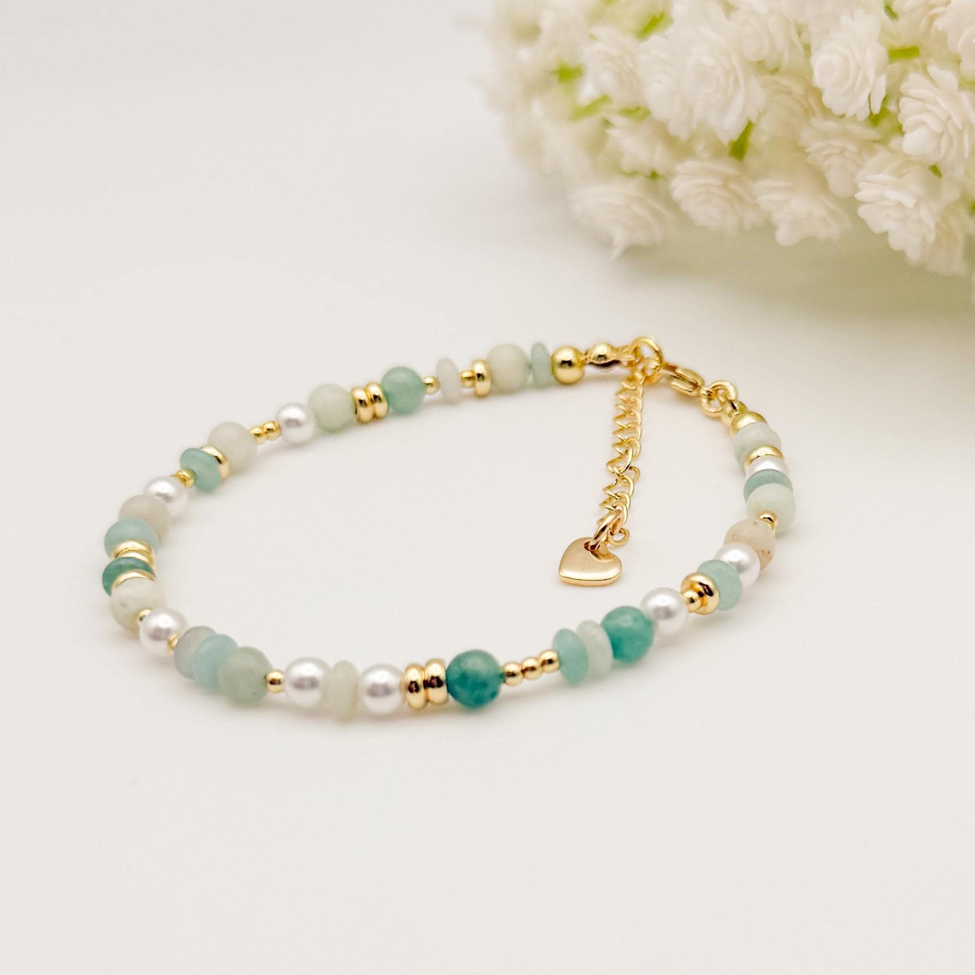Sage and Rose | Beaded Stone Bracelet | 18k Gold filled Bracelet | Gemstone with pearl | Pearl Bracelet | assorted pattern | clasp bracelet