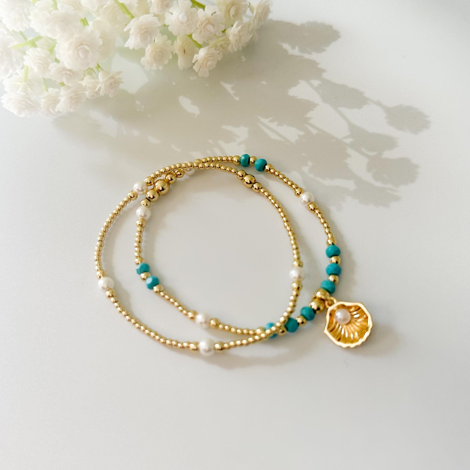 Seashell and pearl charm bracelet set | 18k gold filled teal and pearl bracelet