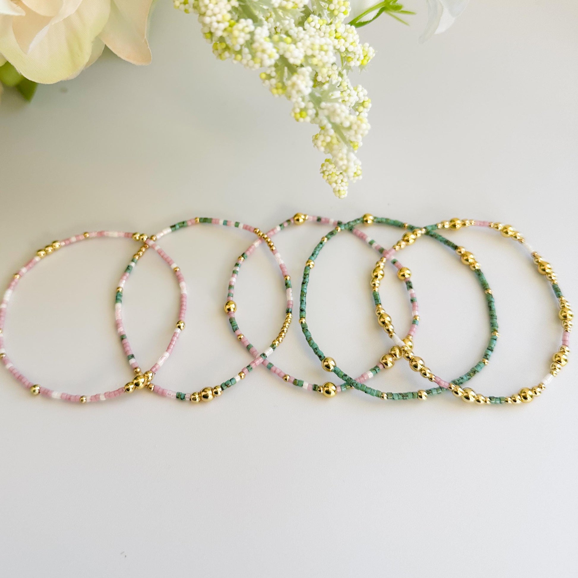 Spring Bloom | 18k gold filled with green and pink bracelet stack | beaded stretch bracelet | tiny bead bracelet | seed bead | bracelet set